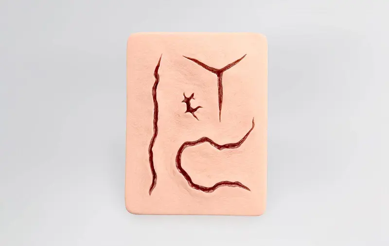 当社の創傷モデル製品カテゴリーをご覧ください。それぞれ、さまざまな用途に合わせて設計されています。粘着性創傷モデルは、特定の医療事例や治療法を迅速にシミュレーションするために開発されました。例えば、訓練用人形での創傷シミュレーションなどに使用できます。当社のスティケットも粘着性で、ほぼどこにでも貼り付けることができます。さまざまなサイズのフレームモデルは、頑丈で高品質の白いフレームにより、さまざまな医療用途や創傷ケアのトレーニングに適しています。スリーブは、ストッキングのように腕や脚に装着することができます。ポケットサイズの創傷は、スマートフォンとサイズや形状が似ており、持ち運びが簡単です。針と糸を使ったさまざまな縫合技術を練習するには、プロの創傷ケア用縫合パッドをお勧めします。タブレットケースに収められた当社のタブレット創傷は、スタイリッシュな視覚教材となります。創傷被覆を模倣し、創傷の洗浄を実演・練習するために、当社独自にフィブリン模造品の配合を開発しました。